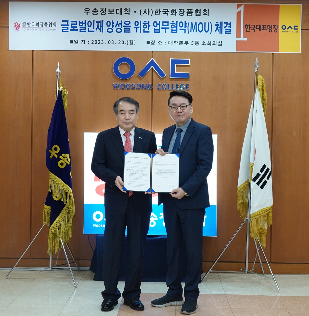 | ▲ 한국화장품협회-우송정보대, 'K-뷰티 글로벌인재 양성' 협약식 이달영 우송정보대 총장(왼쪽)과 권용수 한국화장품협회장. [한국화장품협회 제공. 재판매 및 DB 금지] |