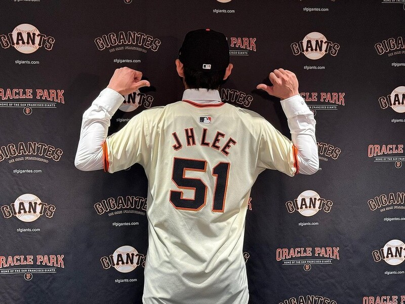 | ▲ 이정후 등번호 51번 (샌프란시스코=연합뉴스) 김태종 특파원 = 이정후가 15일(현지시간) 미 캘리포니아주 샌프란시스코 오라클파크에서 열린 샌프란시스코 자이언츠 입단식에서 유니폼과 모자를 쓰고 등번호를 보이고 있다. 2023.12.16 taejong75@yna.co.kr |