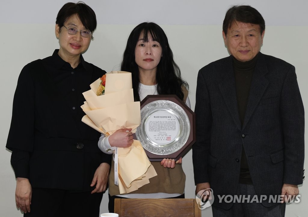 | ▲ 제46회 이상문학상, 최진영 작가 (서울=연합뉴스) 한상균 기자 = 27일 서울 중구 달개비에서 열린 제46회 이상문학상 대상 수상 기자간담회에서 최진영 작가가 상을 받고 있다. 왼쪽부터 문학사상 임지현 대표, 최 작가, 권영민 편집주간. 2023.1.27 xyz@yna.co.kr |