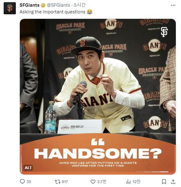 샌프란시스코 구단은 소셜미디어를 통해 "이정후가 중요한 질문을 했다"라며 '핸섬?'이라고 묻는 이정후의 모습을 소개했다.