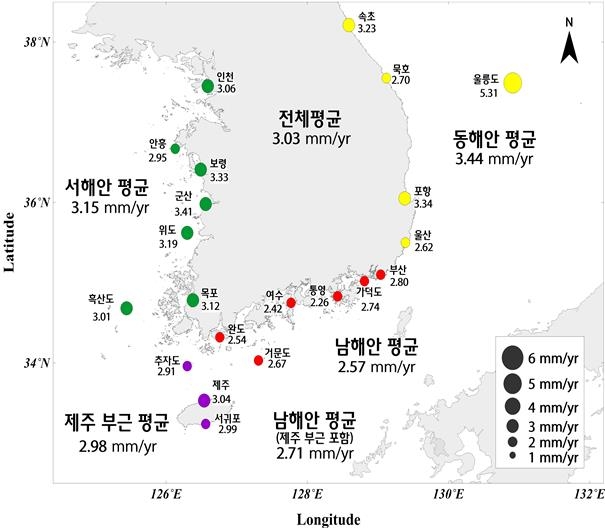 The East Sea saw the largest increase of 3.44 mm per year on average, followed by the Yellow Sea with 3.15 mm and the southern sea with 2.71 mm per year, the data showed.