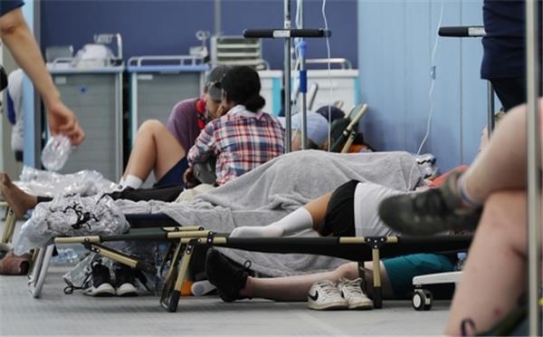 | ▲ Participants in the 2023 World Scout Jamboree receive medical treatment at a hospital set up at the campsite in the reclaimed Saemangeum wetland area for heat-related illnesses on Aug. 3, 2023. (Yonhap) |