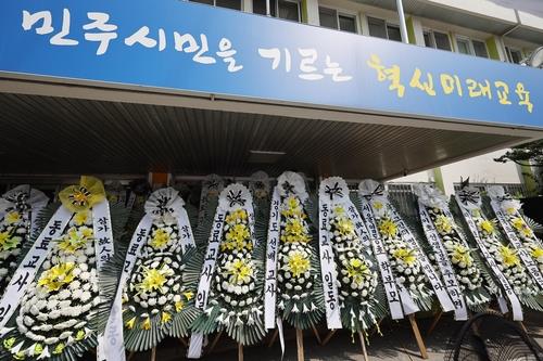 | ▲ Flowers mourning the suicide of a young teacher are placed in front of the Gangnam Seocho Office of Education on July 21, 2023. (Yonhap) |