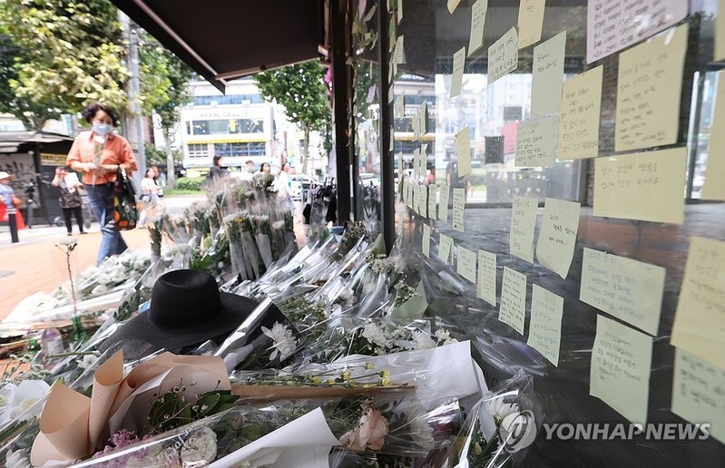 | ▲ This file photo shows a mourning altar set up near Sillim Station in Seoul after a stabbing rampage killed one man and wounded three others on July 25, 2023. (Yonhap) |