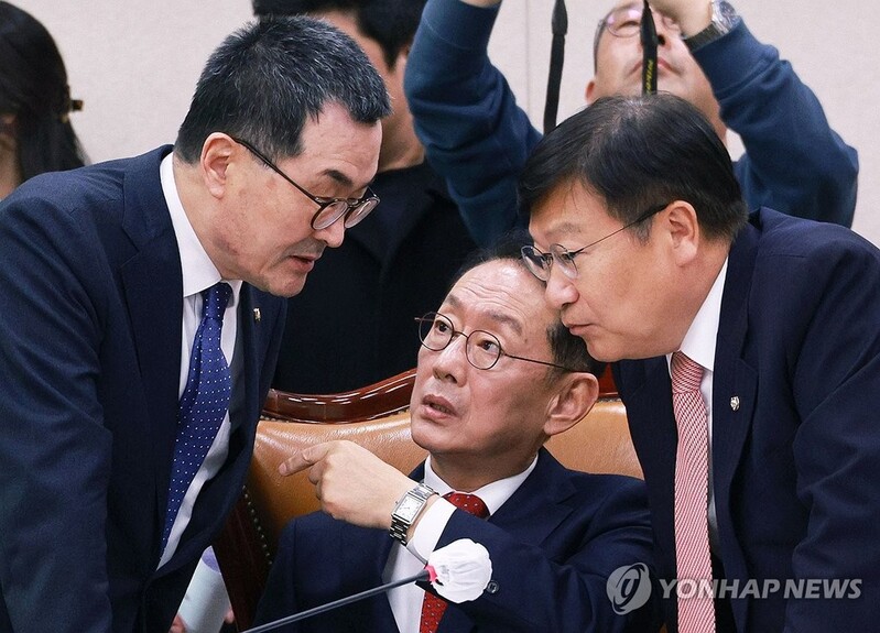 | ▲ Lawmakers from the two major rival parties discuss matters during a meeting of the parliamentary legislation and judiciary committee, at the National Assembly in Seoul, in this photo taken Dec. 7, 2023. (Yonhap) |