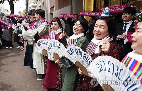 | ▲ South Korean supporters gather outside the Palais des Congres, the venue of the 173rd general assembly of the Bureau International des Expositions in Paris, before its members vote for the host city of the 2030 World Expo among South Korea's Busan, Rome of Italy and Riyadh of Saudi Arabia, on Nov. 28, 2023. (Yonhap) |