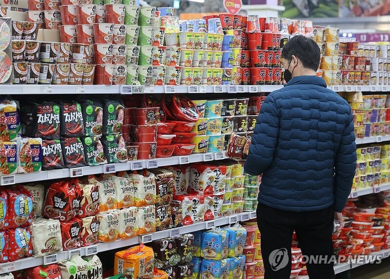 | ▲ A man shops for ramyeon, a South Korean oil-fried instant noodle, at a supermarket in Seoul on Dec. 10, 2023. (Yonhap) |