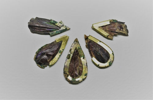 출토 유물 중에는 신라 고분에서 지금까지 확인된 적 없는 형태와 크기의 비단벌레 금동장식도 있다. 이 유물은 무덤 주인 머리맡의 부장품 상자가 있던 자리 상부에서 수십 점이 나왔다. 비단벌레의 딱지날개 2매를 겹쳐 물방울 모양으로 만들고, 앞뒤 가장자리를 금동판으로 고정해 제작했다. 크기는 가로 1.6㎝, 세로 3㎝, 두께 2㎜ 정도다.