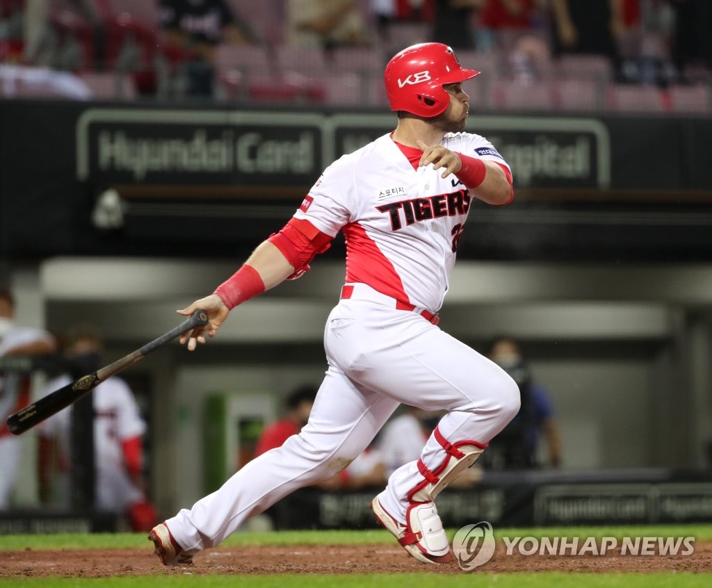 | ▲  In this file photo from July 9, 2021, Preston Tucker of the Kia Tigers hits an RBI double against the KT Wiz in the bottom of the fifth inning of a Korea Baseball Organization regular season game at Gwangju-Kia Champions Field in Gwangju, 330 kilometers south of Seoul. (Yonhap) |