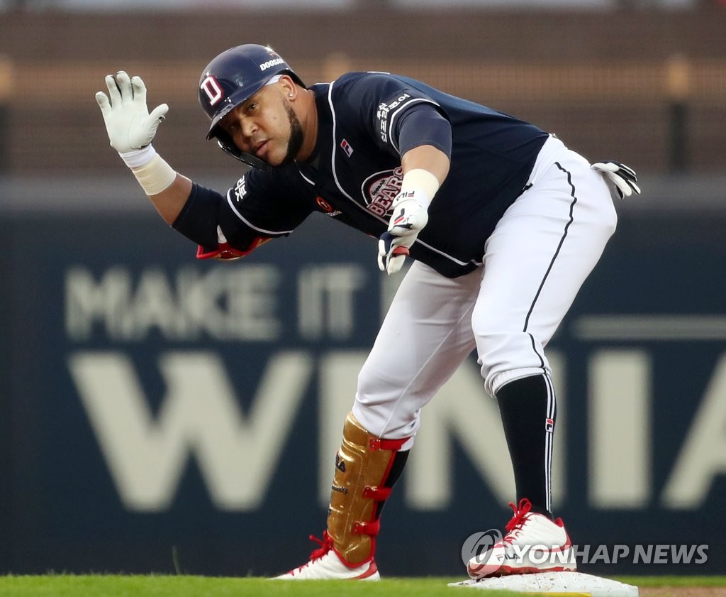 | ▲  In this file photo from July 2, 2021, Jose Miguel Fernandez of the Doosan Bears celebrates his double against the Kia Tigers in the top of the fourth inning of a Korea Baseball Organization regular season game at Gwangju-Kia Champions Field in Gwangju, 330 kilometers south of Seoul. (Yonhap) |