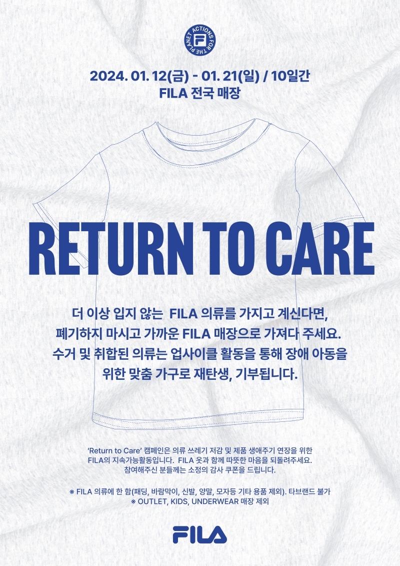 고객은 더 이상 입지 않는 휠라 의류를 이달 12∼21일 아웃렛 매장을 제외한 전국 휠라 오프라인 매장에 기부할 수 있다.