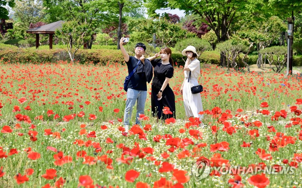 (남원=연합뉴스) 전북 남원시 향교동의 향기원에 꽃양귀비가 만개한 가운데 탐방객의 발길이 이어지고 있다.