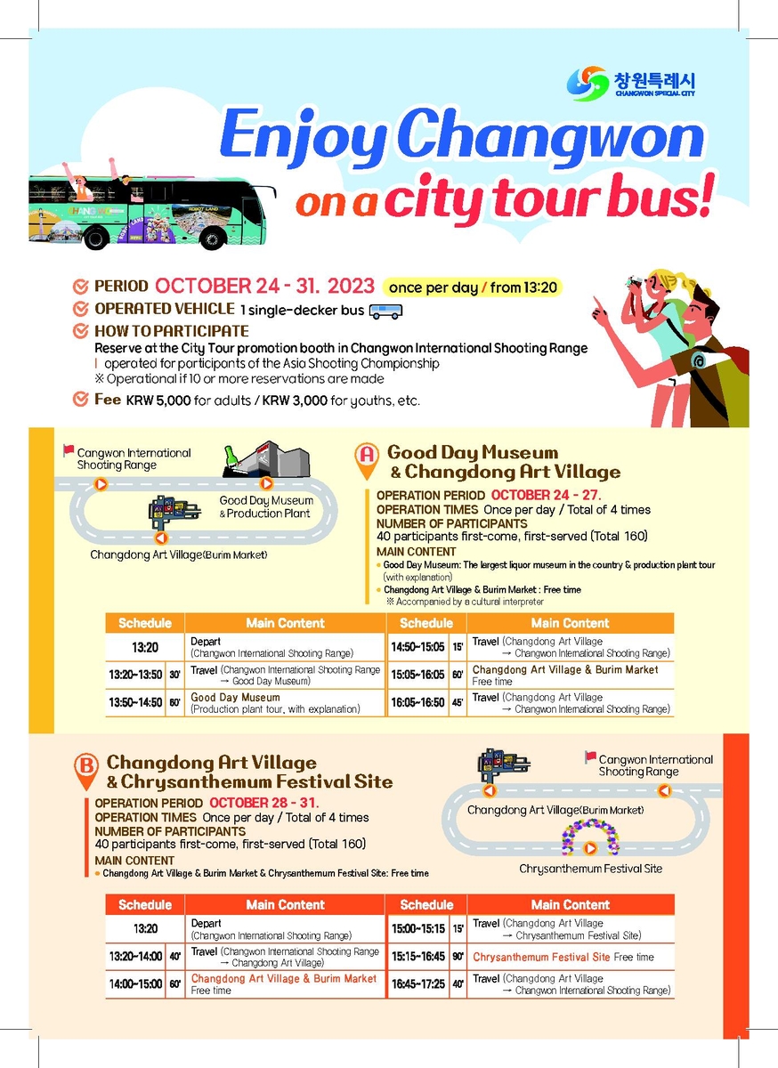 탑승 신청을 희망할 경우 아시아사격선수권대회 기간 창원국제사격장 전투사격장 앞에 있는 창원 시티투어 홍보부스에서 신청(매회 선착순 40명)하면 된다.