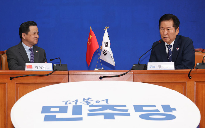 Jung Chung-rae (R), chief of the ruling Democratic Party, talks with Chinese Ambassador to South Korea Dai Bing during their meeting at the National Assembly in Seoul on Sept. 11, 2025. (Yonhap)