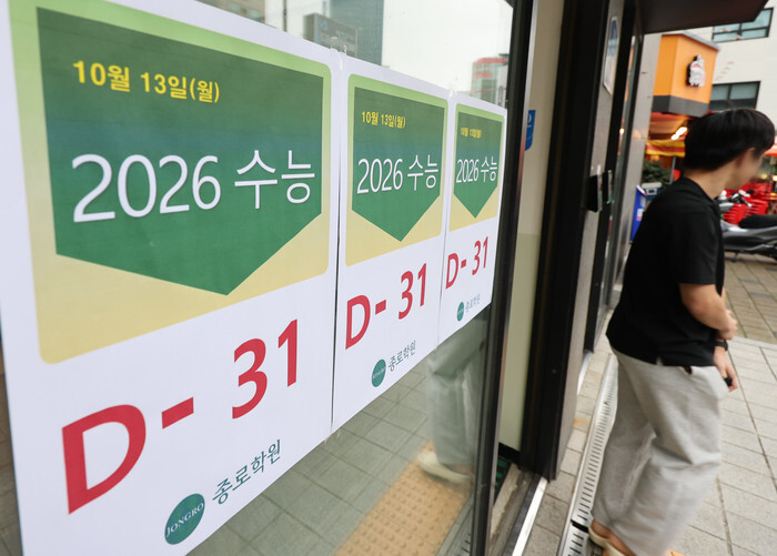 Signs showing the 31-day countdown to the upcoming state scholastic aptitude test are posted on the door of a private tutoring institute in Seoul on Oct. 13, 2025. The test, to be administrated across the country on Nov. 13, is a key deciding factor in college entrance. (Yonhap)