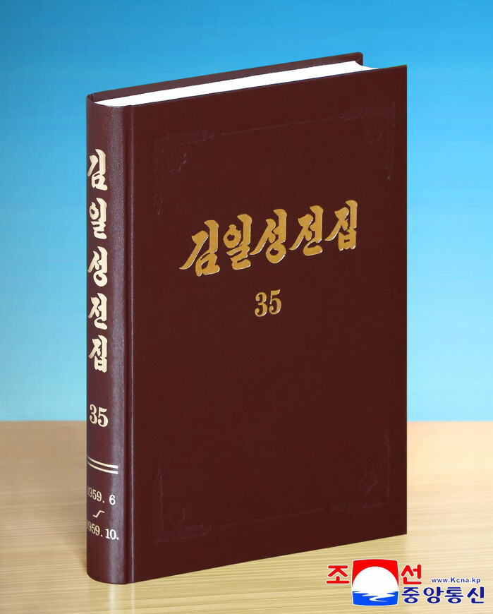 This photo, released by North Korea's official Korean Central News Agency on July 23, 2025, shows the recently published revised 35th volume of the "Complete Collection of Kim Il-sung's Works," a chronological compilation of speeches, statements and decisions made by the late North Korean founder from June to October 1959. (For Use Only in the Republic of Korea. No Redistribution) (Yonhap)