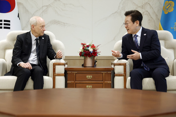 President Lee Jae Myung (R) talks with Michael Sandel, a professor of political philosophy at Harvard University, during their meeting at the presidential office in Seoul on Sept. 18, 2025. (Pool photo) (Yonhap)