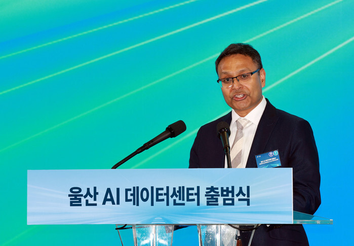 Prasad Kalyanaraman, vice president of infrastructure services at Amazon Web Services (AWS), speaks during a ceremony at the Exhibition and Convention Center in the southeastern industrial city of Ulsan on June 20, 2025, to launch a project to build an artificial intelligence (AI) data center to be jointly built by SK Group and AWS. (Pool photo) (Yonhap)