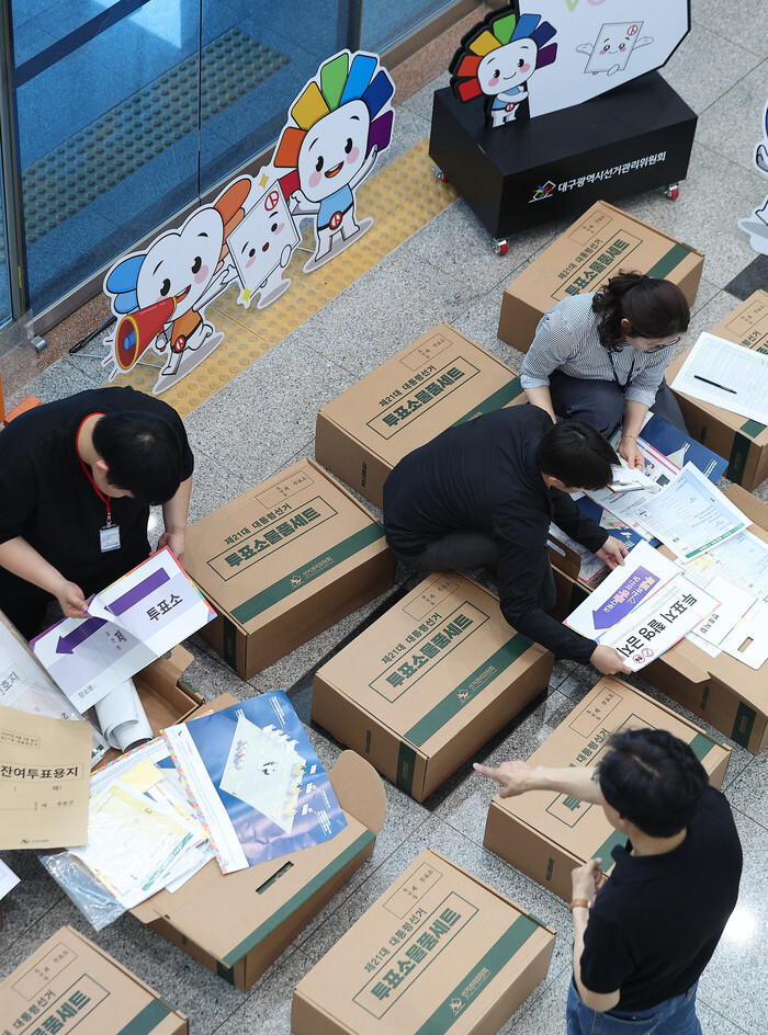 Employees check boxes of items to be used at polling booths for the June 3 presidential election at an office of the National Election Commission in the southeastern city of Daegu on May 16, 2025. (Yonhap)