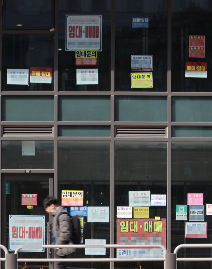 A man walks past a commercial building with leasing banners attached to its windows in Seoul on Feb. 25, 2025. Small business owners in South Korea saw their income drop more than 10 percent from a year earlier in 2024 amid sluggish consumer sentiment, according to a poll commissioned by the Federation of Korean Industries. (Yonhap)