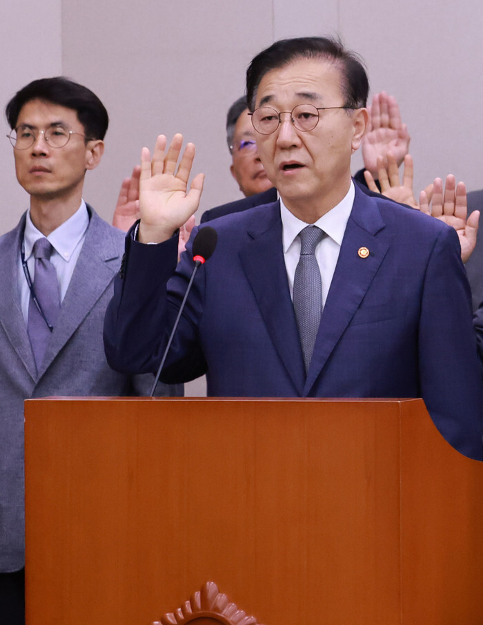 Land and Transport Minister Kim Yun-duk takes an oath during a parliamentary inspection of his agency by the Land, Infrastructure and Transport Committee at the National Assembly in Seoul on Oct. 13, 2025. (Yonhap)