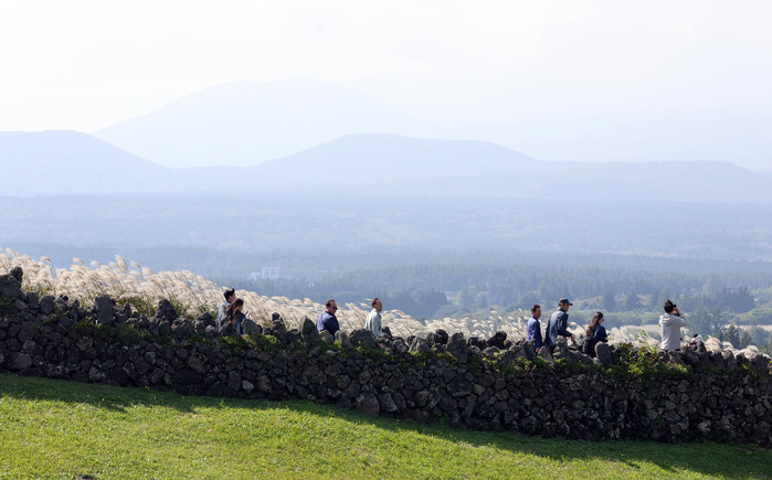 Visitors stroll through a field of silver grass on the southern resort island of Jeju on Oct. 26, 2025. (Yonhap)