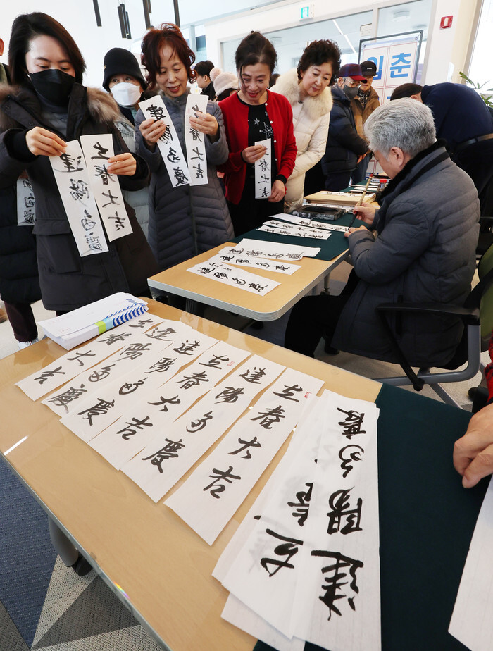 A calligrapher writes Chinese characters with a calligraphy brush for visitors at a cultural center in the southeastern port city of Busan on Jan. 16, 2025, ahead of "Ipchun," one of the 24 seasonal divisions of the calendar that marks the onset of spring, which falls on Feb. 4 this year. He is writing springtime blessings -- "Ipchun Daegil," meaning, "Good luck on Ipchun," and "Geonyang Dagyeong," meaning, "With signs of a positive spirit, your family is full of happiness." (Yonhap)