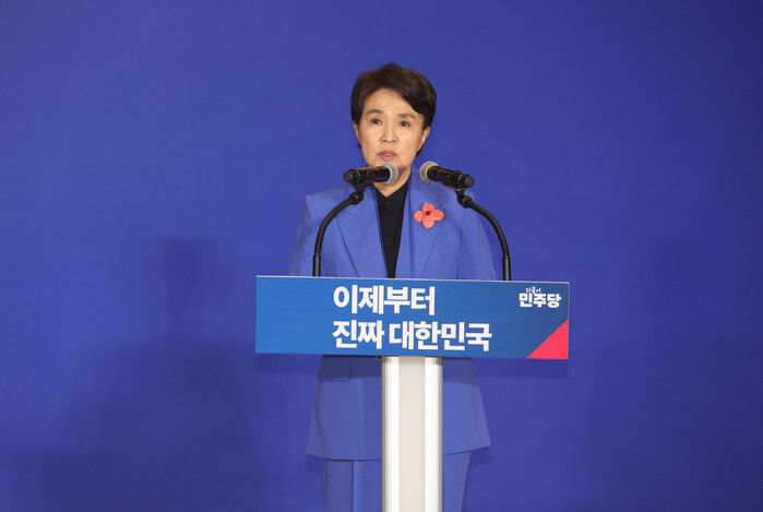 Former Justice Minister Kang Kum-sil, appointed as a co-chair of the liberal Democratic Party's (DP) election committee, speaks during a ceremony at the National Assembly in Seoul on April 30, 2025, to launch the committee that aims to woo both liberal and conservative voters ahead of the June 3 presidential election. (Yonhap)