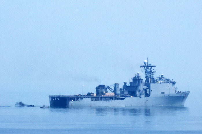 U.S. amphibious combat vehicles enter the USS Harpers Ferry in an exercise conducted in Pohang, 271 kilometers southeast of Seoul, on Aug. 25, 2024, as South Korea and the United States are scheduled to begin their Ssangyong (double dragon) amphibious landing exercise this week. (Yonhap)
