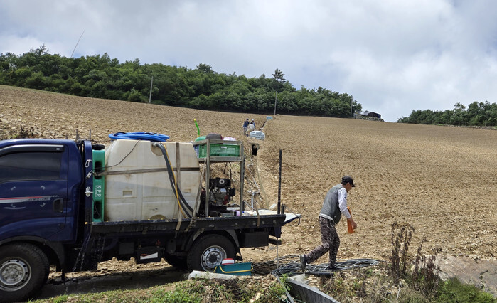 A water truck is deployed to water a mountainside field for growing Chinese cabbages in the city of Gangneung on South Korea's east coast on July 11, 2025, amid a prolonged drought hitting the elevated, cool area, located 1,100 meters above sea level, that is famous for high-quality Chinese cabbages, or "baechu" in Korean. Baechu is one of the main ingredients in making kimchi, a traditional Korean dish made from pickled baechu with spicy seasoning. (Yonhap)