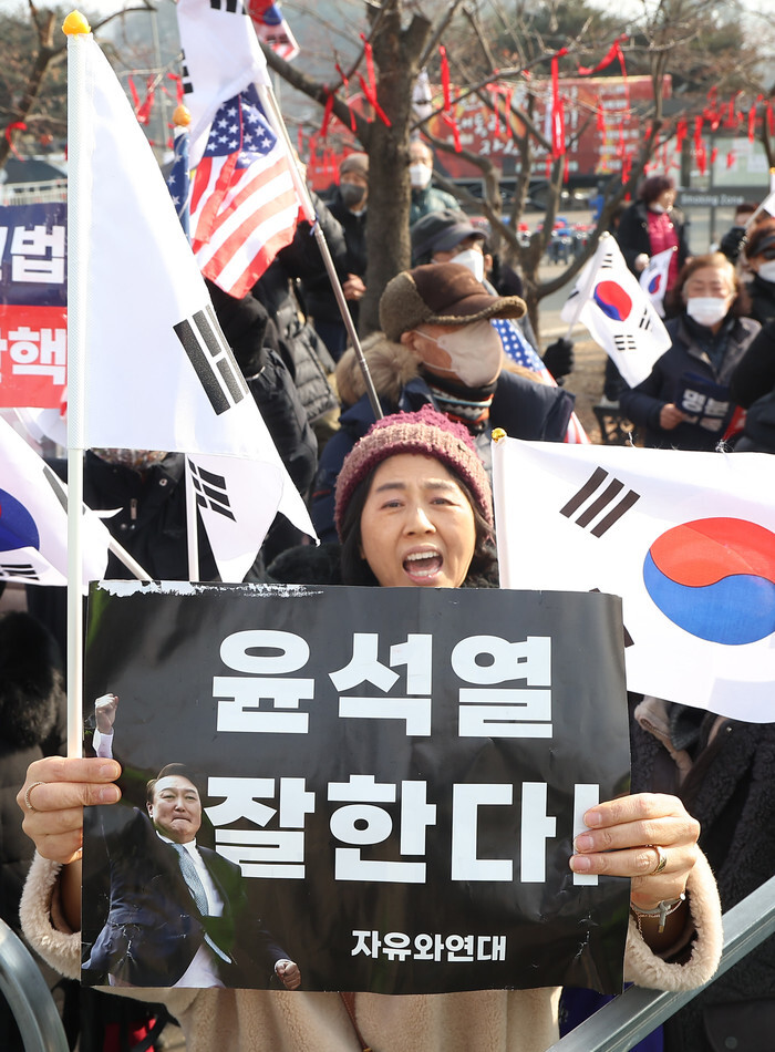 A protestor holding up a sign, which says "Yoon Suk Yeol does a good job," shouts slogans as she joins a rally of impeached President Yoon Suk Yeol's supporters in front of the Seoul Detention Center in Uiwang, just south of Seoul, on Jan. 22, 2025, where Yoon is incarcerated in connection with his short-lived imposition of martial law. (Yonhap)