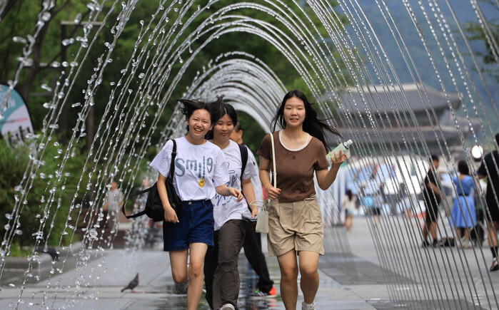 Water fountain tunnelPeople pass under a fountain tunnel at Gwanghwamun Plaza in central Seoul on Aug. 24, 2025. (Yonhap) (END)