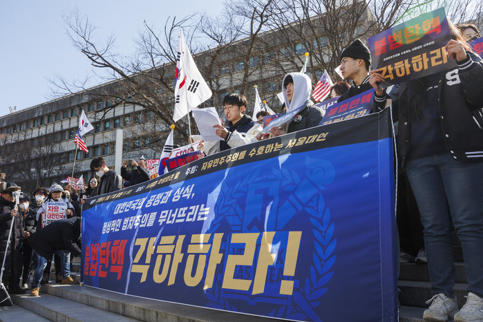 Seoul National University students and conservative activists hold a rally to oppose President Yoon Suk Yeol's impeachment on the campus in southern Seoul on Feb. 17, 2025. (Yonhap)