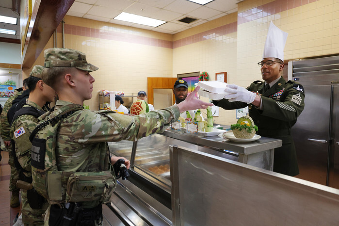 USFK officers distribute Thanksgiving Day food to soldiers at Camp Casey in Dongducheon, north of Seoul, on Nov. 27, 2025. (Yonhap)