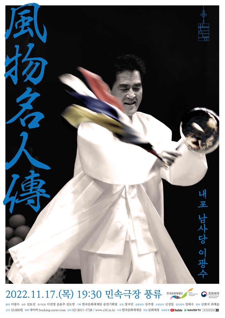 한국문화재재단은 이달 17일 서울 강남구 국가무형문화재전수교육관 민속극장 풍류에서 이광수 명인이 '풍물명인전'(風物名人傳) 공연을 펼친다고 8일 밝혔다.