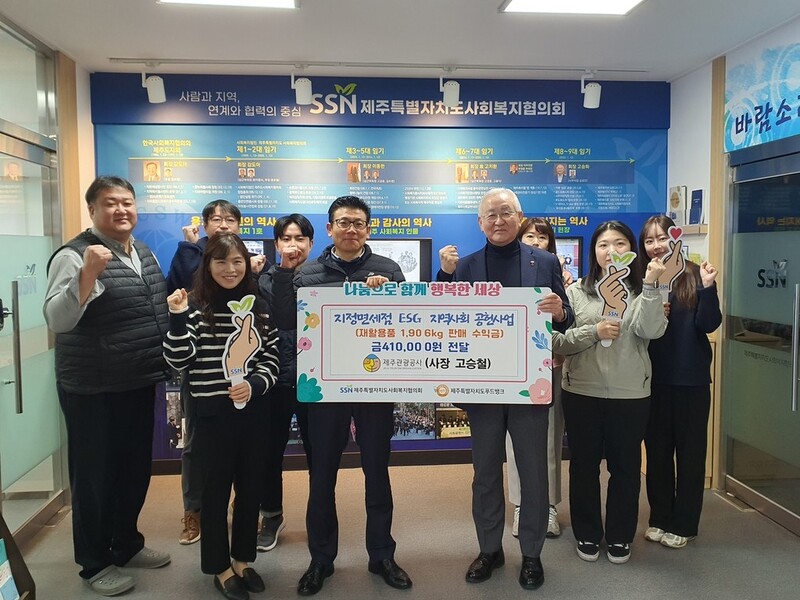 (제주=연합뉴스) 제주관광공사는 21일 도내 어려운 이웃을 위한 따뜻한 나눔 활동에 동참하기 위해 '지정면세점 제로웨이스트 사업' 판매 수익금 41만원을 제주도사회복지협의회에 전달했다.