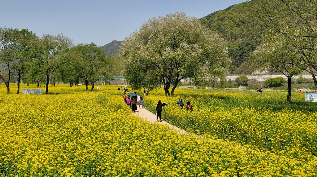 지난 주말 일반에 개방된 뒤 평일에도 수 천 명이 찾아와 유채꽃밭 사이로 난 산책로를 걷거나 사진 찍으며 봄 정취를 즐기고 있다.