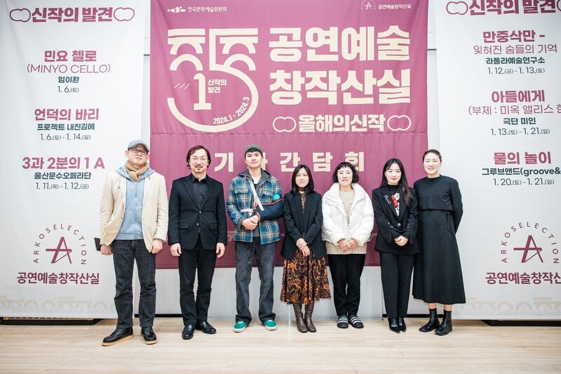 | ▲ '공연예술창작산실 올해의 신작' 기자간담회 왼쪽부터 '3과 2분의 1 A' 김관 연출·황성진 지휘자, '언덕의 바리' 김정 연출, '민요 첼로' 임이환 예술감독, '아들에게' 김수희 연출, '만중삭만 - 잊혀진 숨들의 기억' 김고은 기획, '물의 놀이' 이상경 음악감독 [한국문화예술위원회 제공. 재판매 및 DB 금지] |