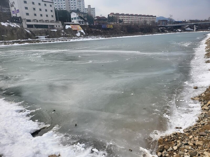 야외 얼음벌판에 구멍을 뚫어 낚싯대를 드리울 홍천강이 제대로 얼지 않아 강 위에 플라스틱으로 된 임시시설물(부교)을 설치했다.