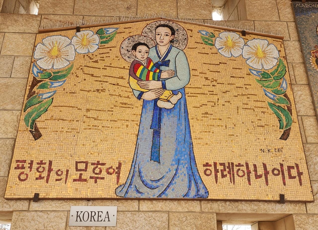 | ▲ 한복입은 마리아와 예수 (나사렛=연합뉴스) 양정우 기자 = 29일(현지시간) 이스라엘 북부 나사렛에 있는 '수태고지' 교회 외부 벽면에는 한복을 입은 마리아와 예수의 모습을 담은 한국 성화가 걸려 있다. 2022.11.30 eddie@yna.co.kr (끝) |