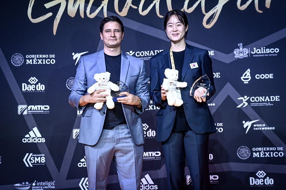 | ▲ 최우수 지도자상을 받은 오혜리 코치(오른쪽). [세계태권도연맹 제공. 재판매 및 DB 금지] |