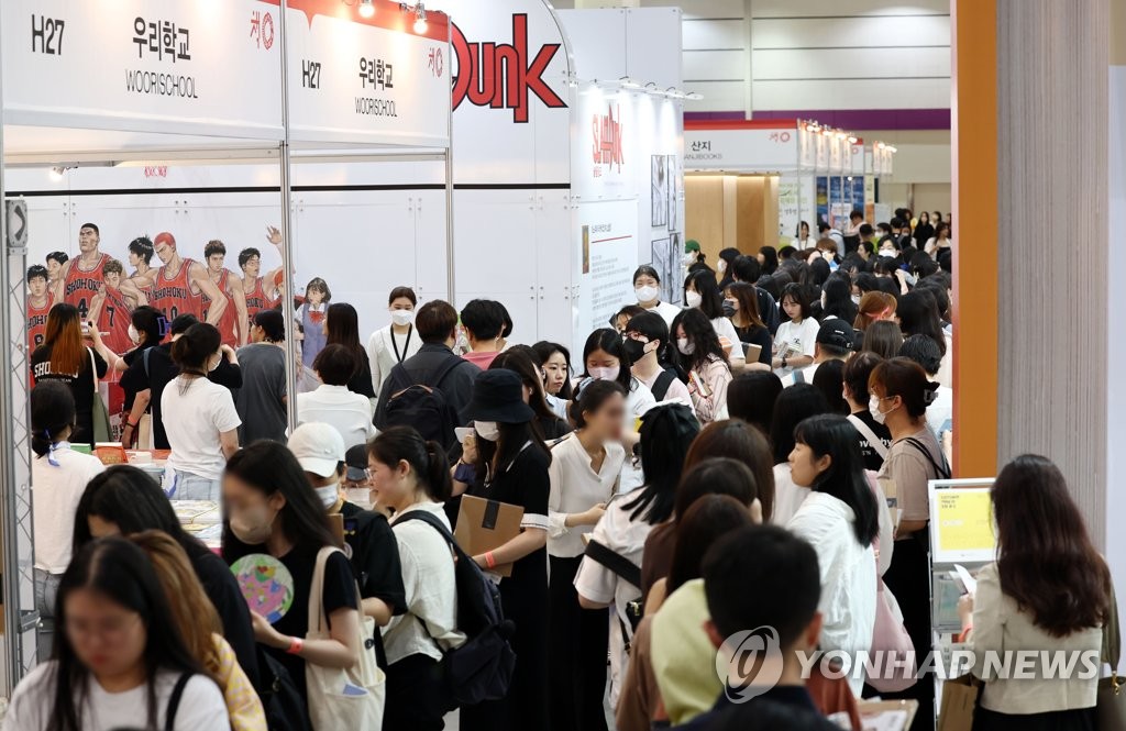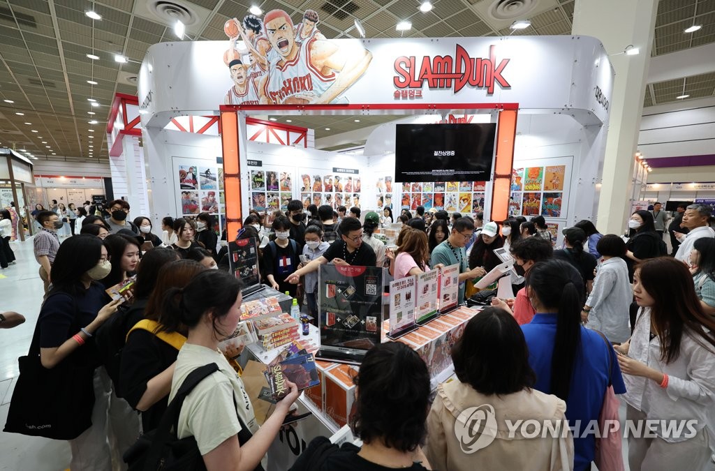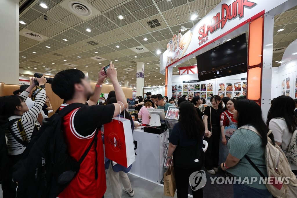 | ▲ 슬램덩크 부스 인기 (서울=연합뉴스) 김인철 기자 = 14일 서울 강남구 코엑스에서 열린 2023 서울국제도서전에 마련된 슬램덩크 부스에서 관람객들이 책을 사기 위해 줄을 서고 있다. 2023.6.14 yatoya@yna.co.kr |