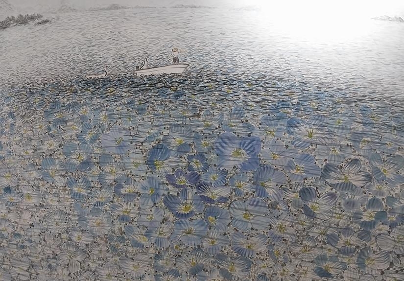 작가가 거주하는 해남군 화원면 온덕리와 매월리 앞 바다에서 삶을 일구며 해조류 양식하는 과정은 물론 자신의 작은 배 매봉호와 쪽배 등의 이미지를 재미있게 표현했다.