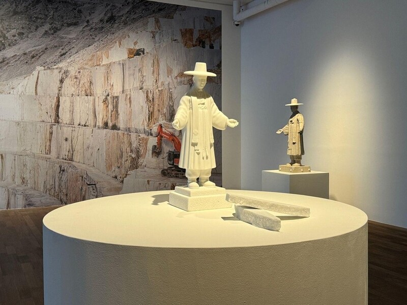 | ▲ 김대건 신부 조각상 서울 평창동 가나아트센터에서 열리는 한진섭 개인전에 전시된 김대건 신부 조각상. 바티칸 성 베드로 대성전 외벽에 설치된 것과 같은 형태의 조각상을 60cm 크기로 새로 만든 작품이다. 앞에 놓인 대리석은 실제 조각상에 사용된 이탈리아 카라라 대리석. [가나아트 제공. 재판매 및 DB 금지] |