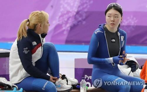 | ▲ This file photo from Feb. 21, 2018, shows South Korean speed skaters Kim Bo-reum (L) and Noh Seon-yeong at Gangneung Oval in Gangneung, 230 kilometers east of Seoul, following their team pursuit race at the 2018 PyeongChang Winter Olympics. (Yonhap) |
