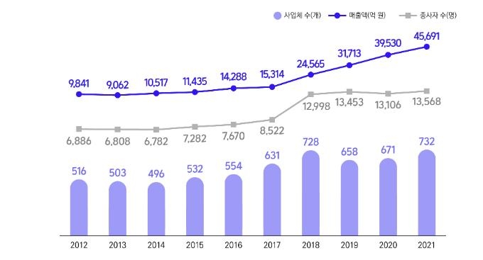 | ▲ 방송영상독립제작사 사업체수, 매출액, 종사자 추이(2012~2021) [한국콘텐츠진흥원 제공. 재판매 및 DB 금지] |