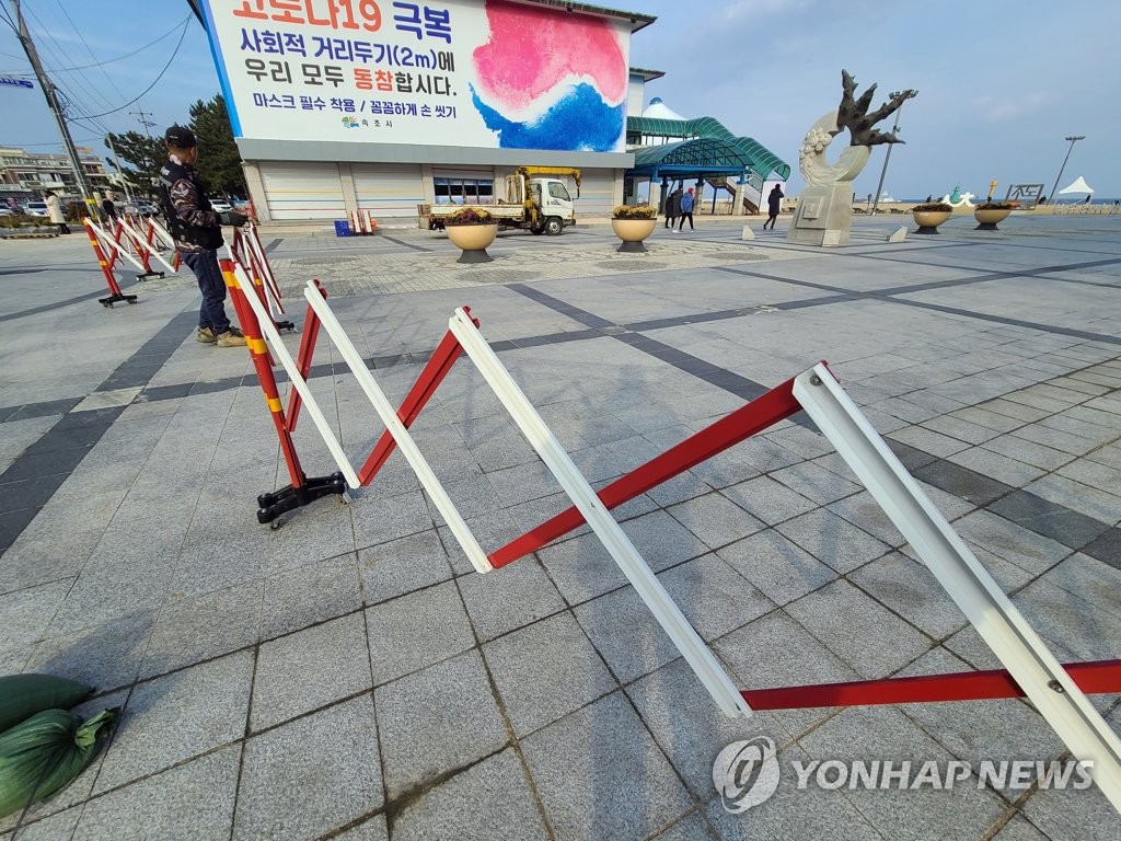 코로나19 확산 방지를 위해 출입 차단선이 둘러쳐진 가운데 일부 관광객만 차단선 밖 먼발치에서 부서지는 파도를 바라보는 모습이 관찰됐다.