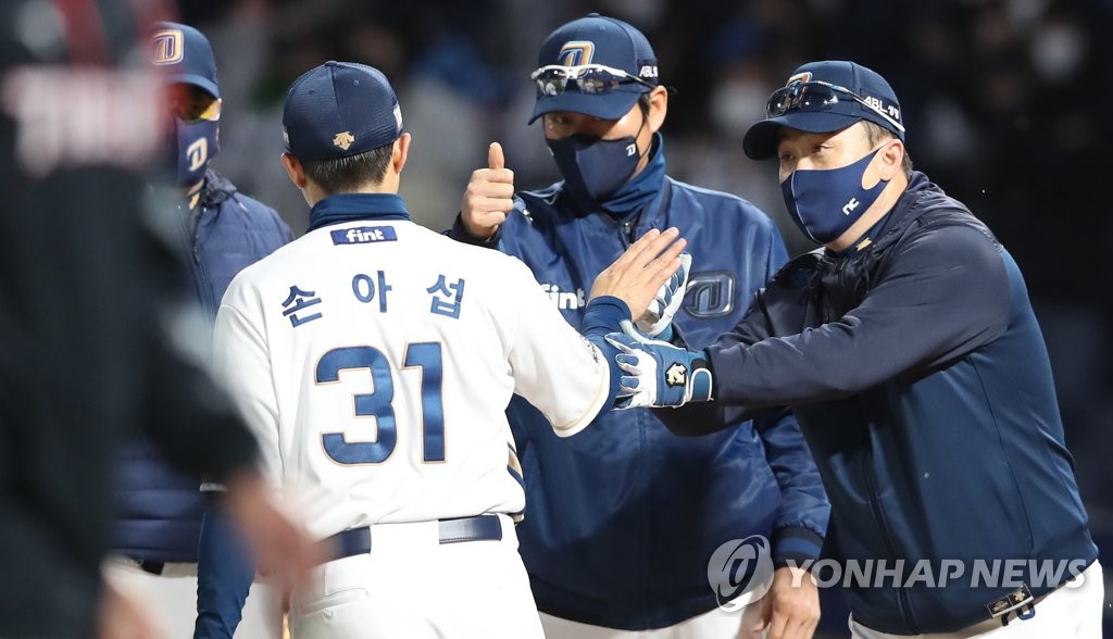 | ▲ In this file photo from April 15, 2022, Lee Dong-wook (R), then manager of the NC Dinos, high-fives outfielder Son Ah-seop after the team's 5-0 victory over the Kia Tigers in a Korea Baseball Organization regular season game at Changwon NC Park in Changwon, 400 kilometers southeast of Seoul. (Yonhap) |