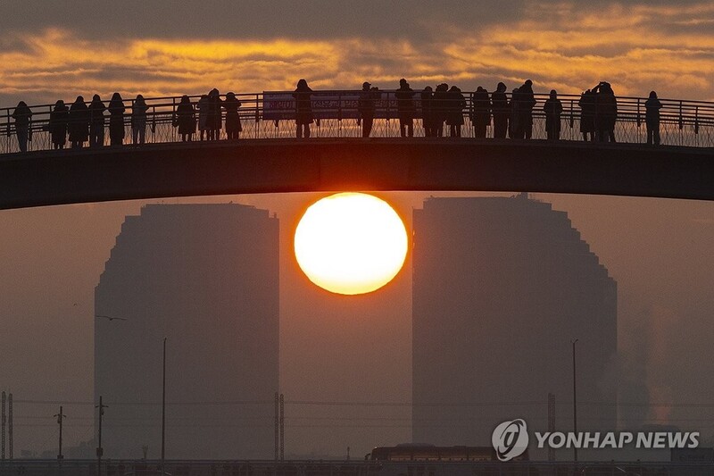 | ▲ 올해 첫 해돋이 (서울=연합뉴스) 윤동진 기자 = 1일 오전 시민들이 서울 영등포구 선유도공원 선유교에서 해맞이객들이 새해 첫 일출을 보고 있다. 2024.1.1 mon@yna.co.kr |