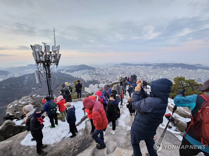 | ▲ 서대문 안산 봉수대 찾은 해맞이객들 (서울=연합뉴스) 류영석 기자 = 2024년 새해를 맞은 1일 오전 서울 서대문구 안산 봉수대에서 해맞이객들이 새해 첫 일출을 보고 있다. 2024.1.1 ondol@yna.co.kr |